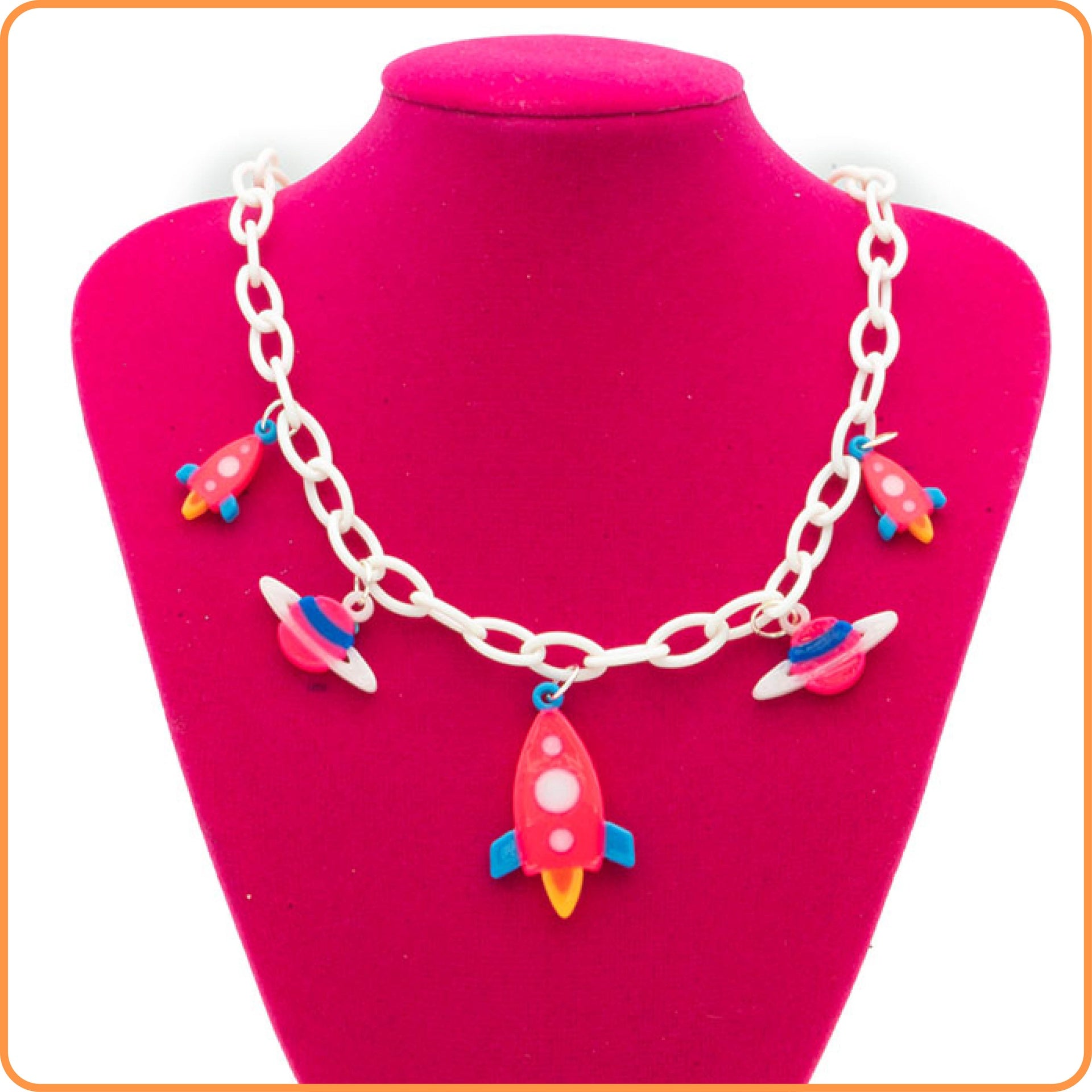 This necklace is made out of plastic chains with custom rocket and planet charms.