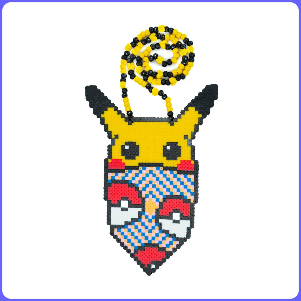 Every necklace is carefully handcrafted with premium perler beads, featuring a Pika Bandana Series design with vibrant colors and video game-inspired graphics that capture the essence of the epic crossover between Pokémon's Pokeball and Super Mario's 1UP mushroom power-up and festival culture.